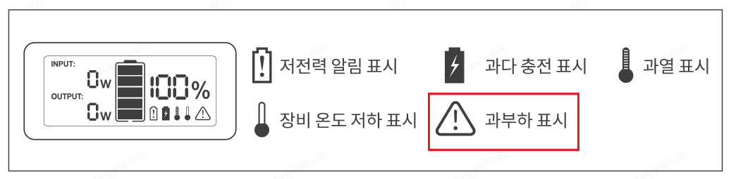 1. 연결된 장비 제거한 후 DISPLAY 버튼을 7초간 길게 눌러 리셋한 후 과부하 표시가 사라졌는지 확인해 주십시오. 과부하 표시가 사라지지 않으면 고장일 수 있으므로 고객 상담 이메일 hello.kr@jackery.com로 연락해 주십시오.